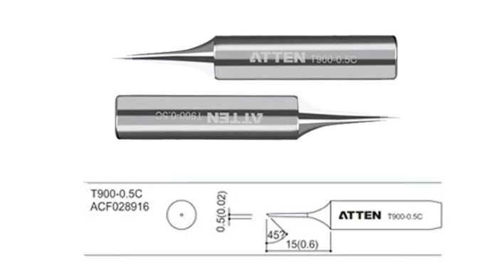 ATTEN T900-0.5C Solder tip is a horseshoe tip suitable for most 936 series soldering stations. The design of the bevel welding at the front of the soldering iron tip has the characteristics of a large welding area, thick terminals, and large solder spots and is suitable for multi-volume welding.