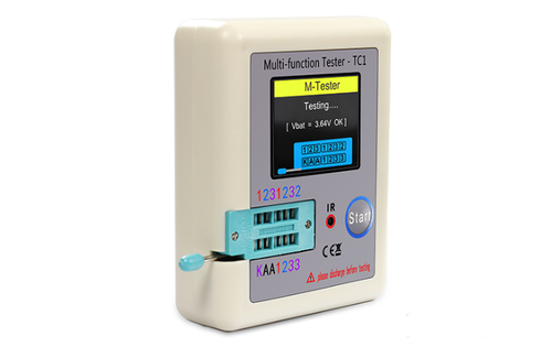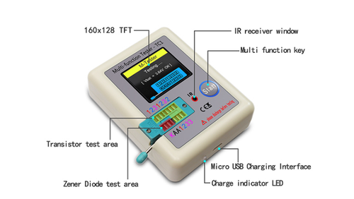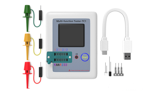 LCR-T1 multi-function tester can test resistor, capacitor, inductance, capacitance ESR, Zener diode (can be tested around 40v), one-way, two-way thyristor, light-emitting diode, etc., with powerful functions and the parameter display is richer. Put the pins of the components in the corresponding position, and turn the small handle, the detector will automatically detect, and the final result will be clearly displayed on the backlit TFT screen.