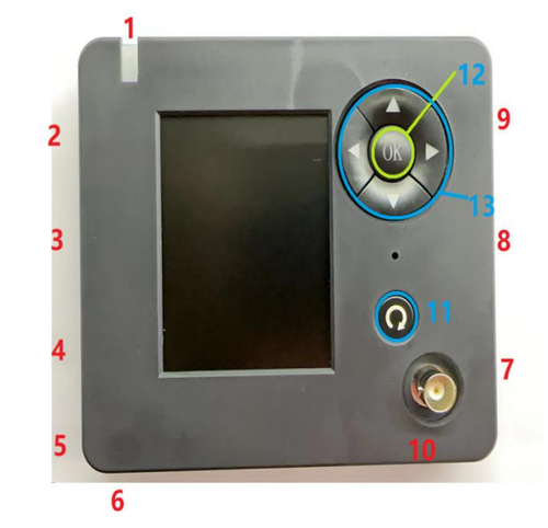 1: Innosilicon Power On/Off Port 2: Bitmain Power On/Off Port 3: Bitmain/Antminer Hashboard Testing Connection Port 4: Bitmain Backup Port 5: Testing Fixture Power Input (DC12V) 6: Testing Fixture Power On/Off Button 7: Innosilicon/Aladdin Hashboard Connection Port 8: Lovecore/Leopard/Xiaqiang Hashboard Connection Port 9: Antminer Power On/Off Port 10: RF Corresponding Chip Testing Port 11: Back Button 12: Model Selection Confirmation Button and Testing Button 13: Directional Buttons, Used to Select Brand and Function