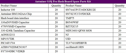 Antminer S19j Pro Hash Board Spare Parts Kit is used to replace the worn or damaged Accessories on the Hash Board during maintenance; in order to reduce the maintenance time of the miner and avoid excessive downtime, the maintenance personnel can purchase a certain amount and carry out reserve. The advantage of spare parts is that they can shorten the maintenance time of the miner and reduce the machine damage caused by the long downtime of the miner. Antminer S19j Pro Hash Board Spare Parts Kit contains vulnerable components on Antminer S19j Pro Hash Board, such as Antminer BM1362AA Chip, 330 6240k Tantalum Capacitor, MP1517DR, PIC16F1704, ATH93702DMCN1937, TMP75, Hash board data interface, etc.