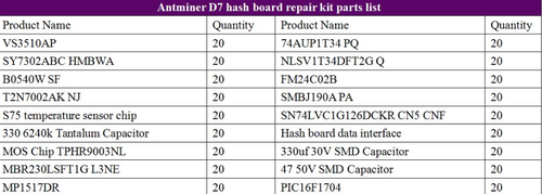 Antminer D7 hash board accessories package, regular maintenance can keep the miner running well and effectively extend the service life of the miner. The long-term operation of the miners increases the wear and tear of the machine parts, accelerates the aging of the machine parts, reduces the mining efficiency, and greatly impacts the service life. The kit includes S75 temperature sensor chip, SMBJ190A PA, PIC16F1704, SY7302ABC HMBWA, MBR230LSFT1G L3NE, 47 50V SMD Capacitor, SN74LVC1G126DCKR CN5 CNF, etc. It is unavoidable that any accessories are easily damaged after being used too much, but it is easy to solve this problem. Antminer D7 hash board repair parts list can solve these problems anytime.
